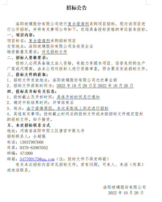 洛陽玻璃股份有限公司復合澄清劑采購項目招標公告