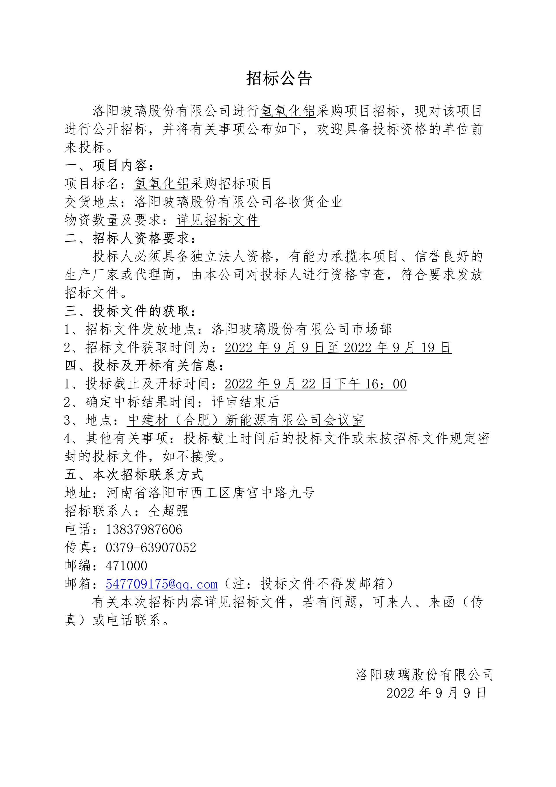 洛陽玻璃股份有限公司氫氧化鋁采購項目招標公告