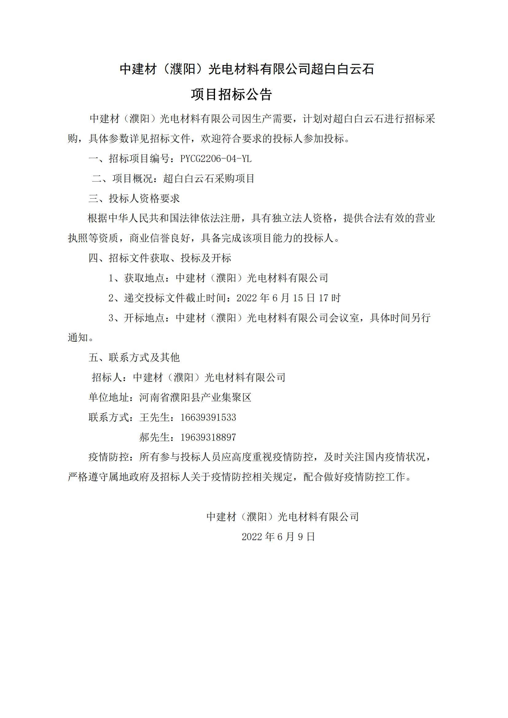 中建材(濮陽)光電材料有限公司超白白云石項目招標公告