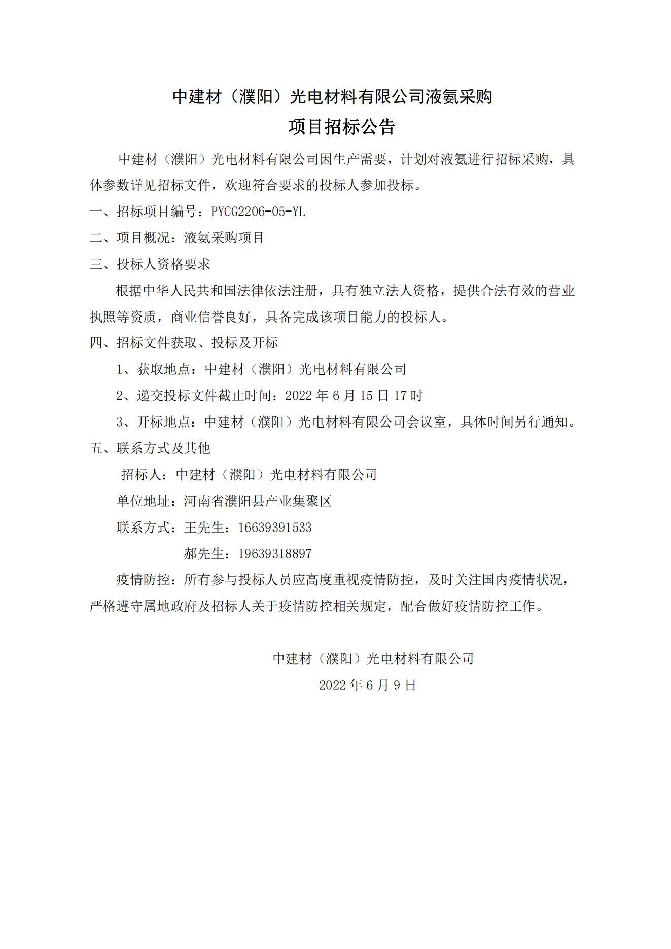 中建材(濮陽)光電材料有限公司液氨采購項目招標公告
